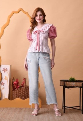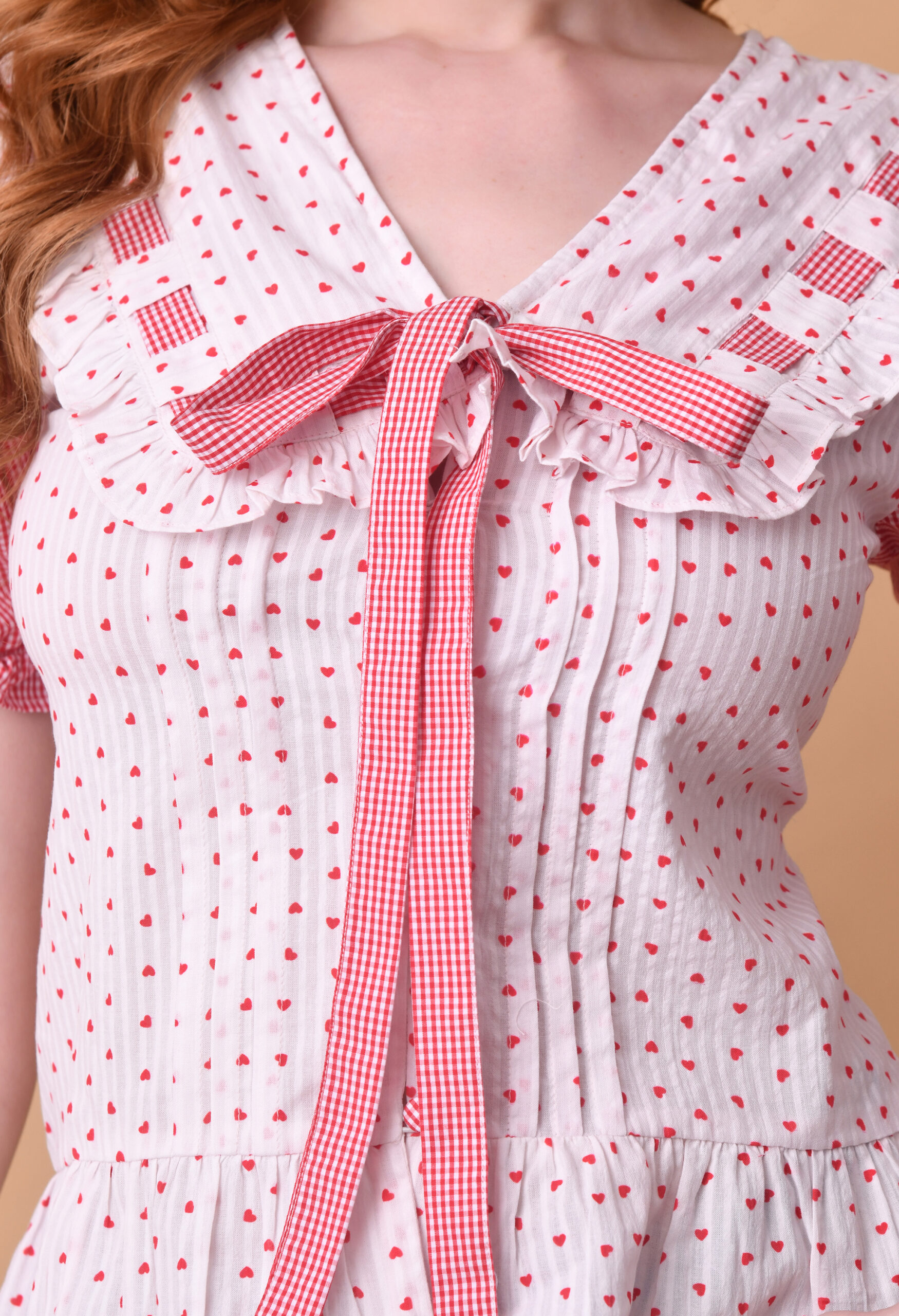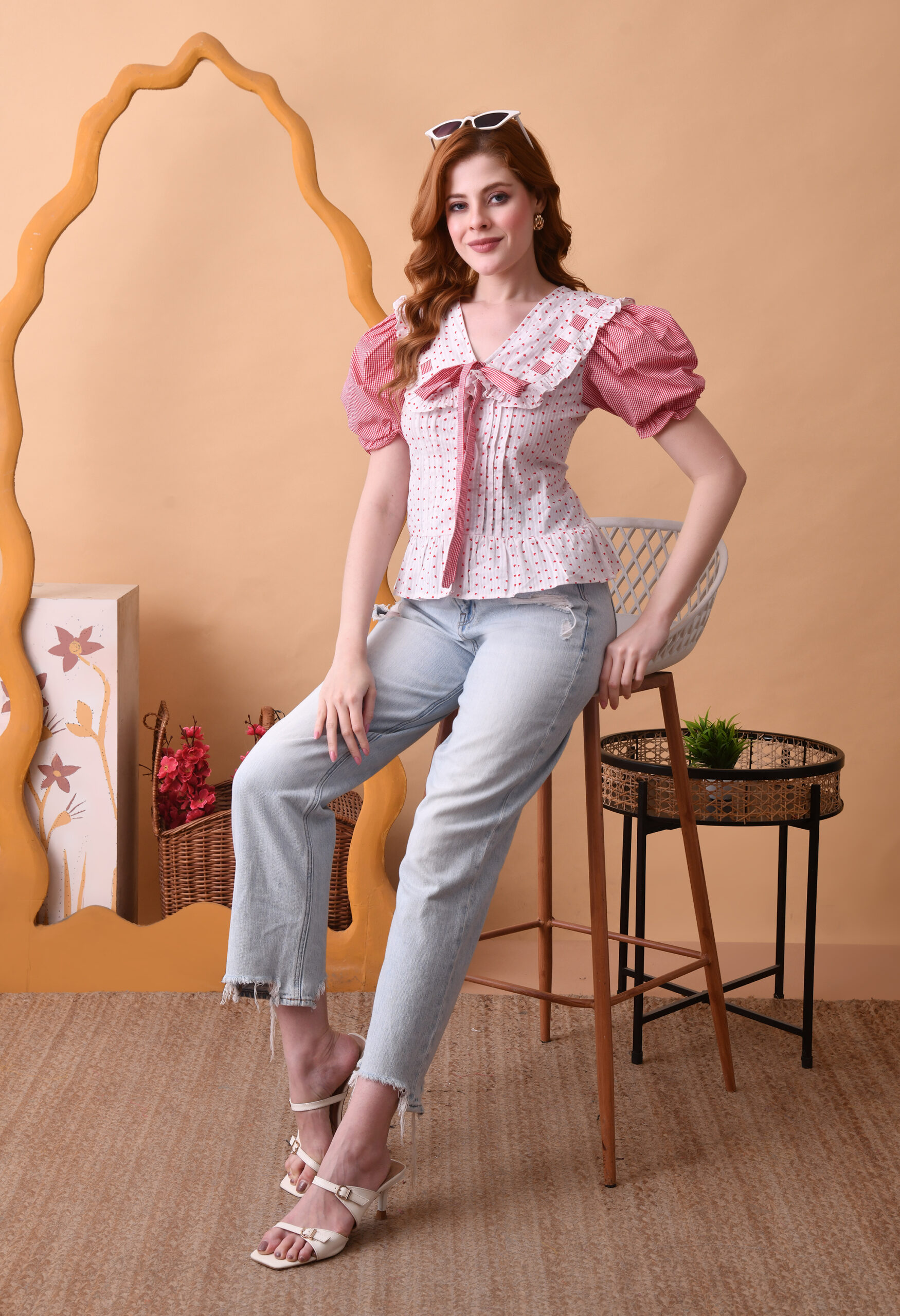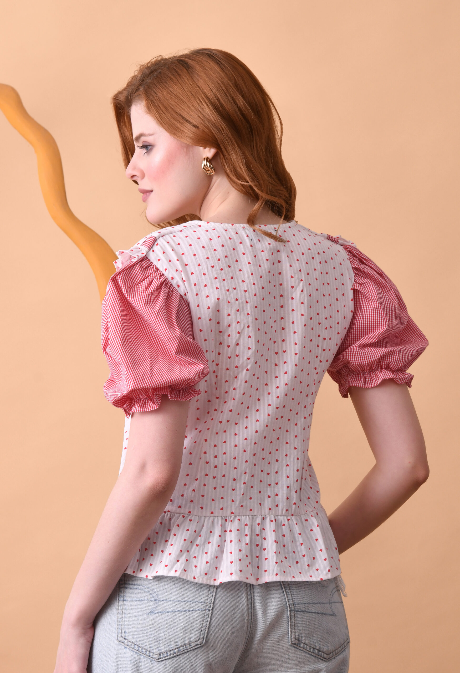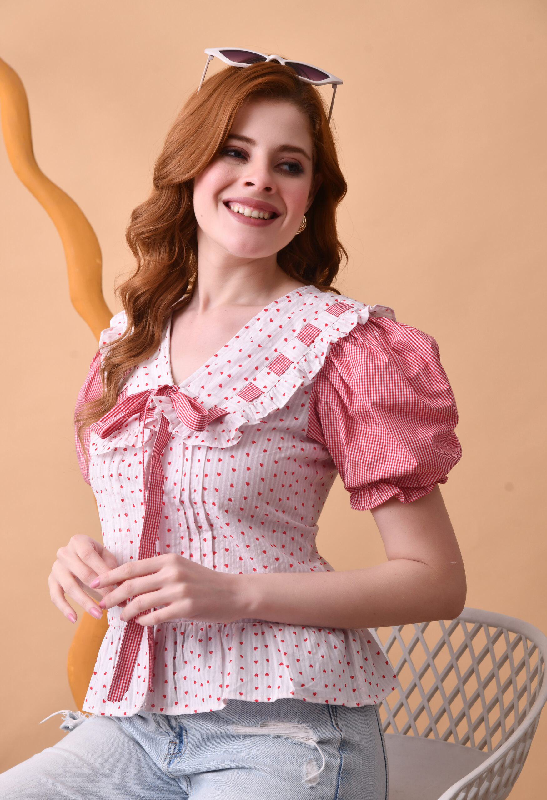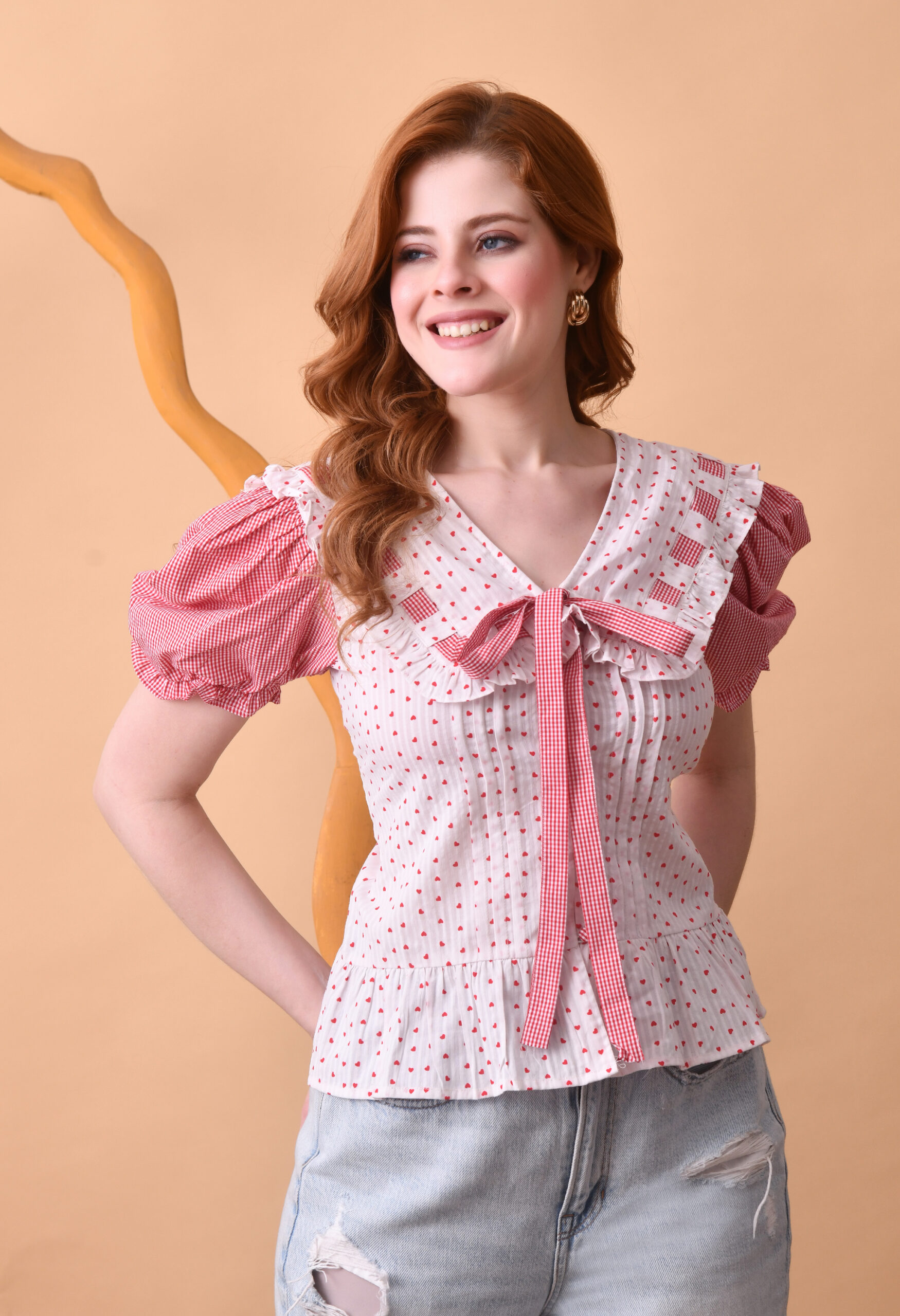 Add a touch of romantic charm to your everyday wardrobe with the Blush Meadow Ruffel Tie Top. Designed in a soft, lightweight fabric, this feminine piece features delicate red polka dots on a creamy base, complemented by gingham puff sleeves for a playful contrast. The ruffled collar and front tie detail create a flattering, vintage-inspired silhouette, while the peplum hem adds a subtle flare at the waist. Perfect for pairing with denim or skirts, this top effortlessly transitions from casual daytime outings to brunch dates in style.